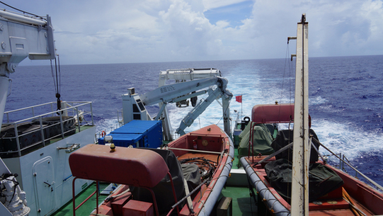 一阵暴雨过后,绿色甲班和白色桅杆被洗得更加干净。没有仪式的渲染,已经出海80多天的船员和科考人员,在关岛整装后重又开始了紧张的工作。